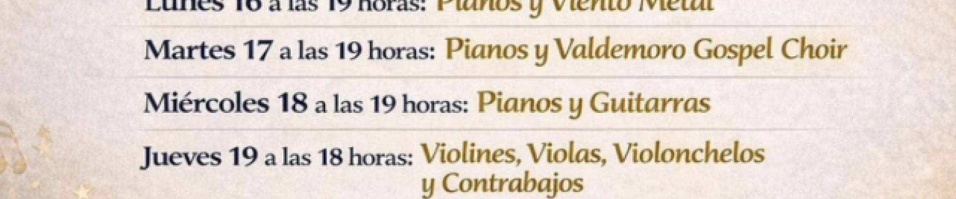 El ciclo se abrirá el viernes 13 de marzo, a las 19:00 horas, con el concierto Pianos y Combos. El lunes 16, a las 19:00, será el turno de Pianos y Viento Metal. La actividad continuará el martes 17, a las 19:00, con Pianos y Valdemoro Gospel Choir, y el miércoles 18, a las 19:00, con Pianos y Guitarras.